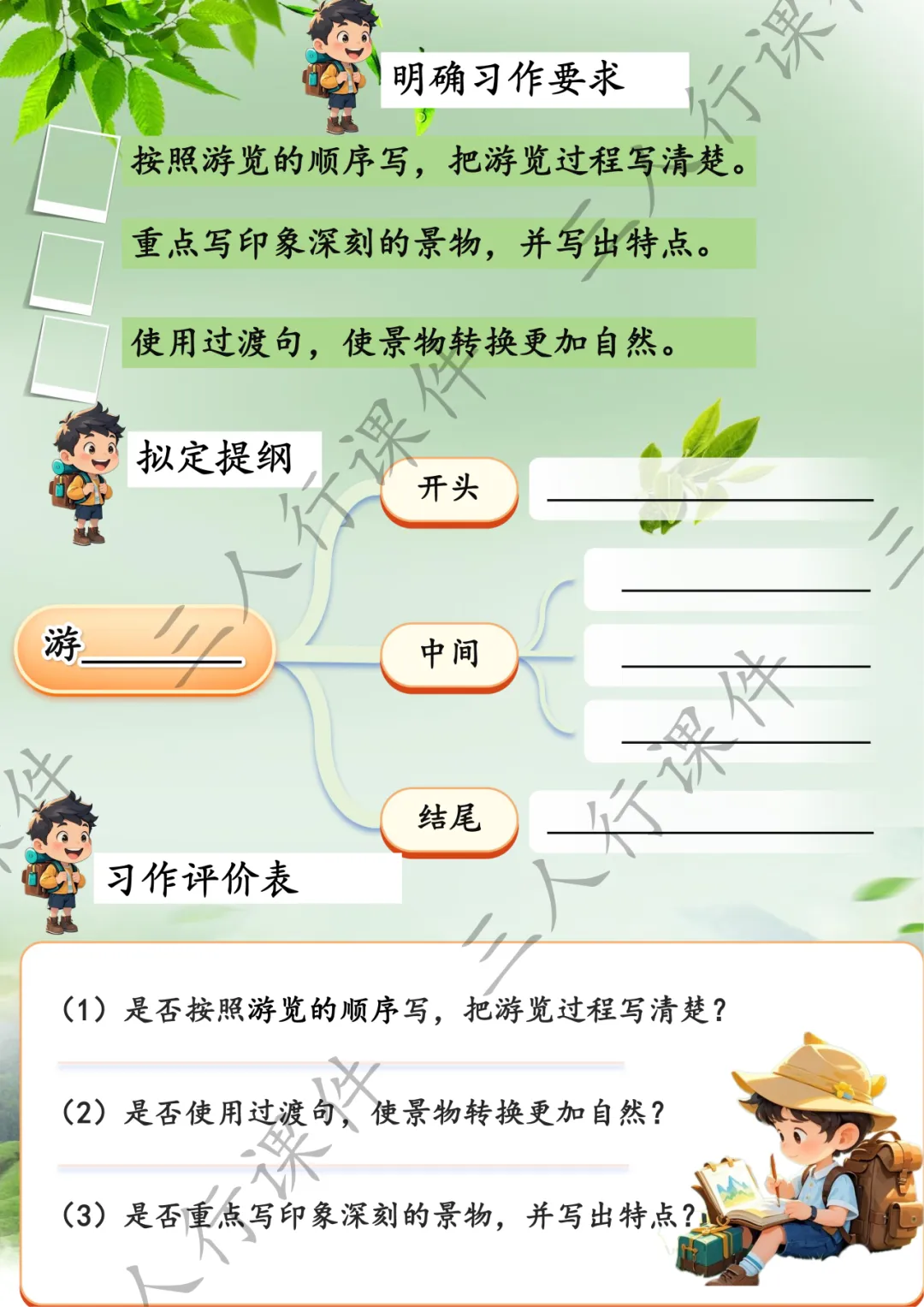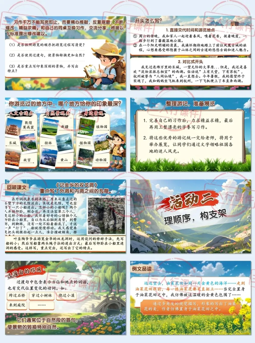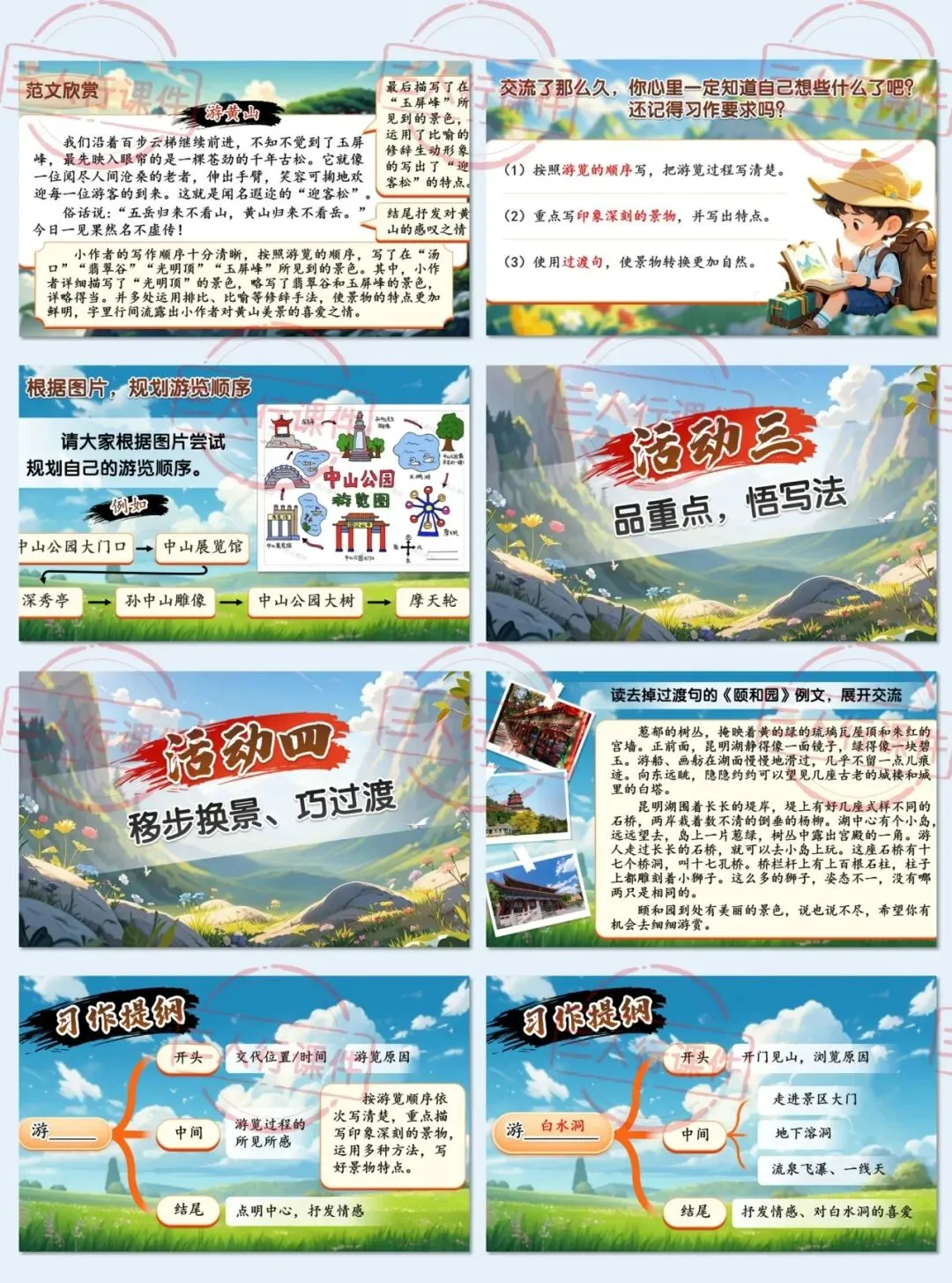 师:没错!你观察得真仔细。从这些课文里我们能发现,按照游览顺序写,读者就能跟着作者的脚步,一步一步感受游览的过程。所以我们在写作前,也可以像这样画出游览路线图,帮助我们理清思路。