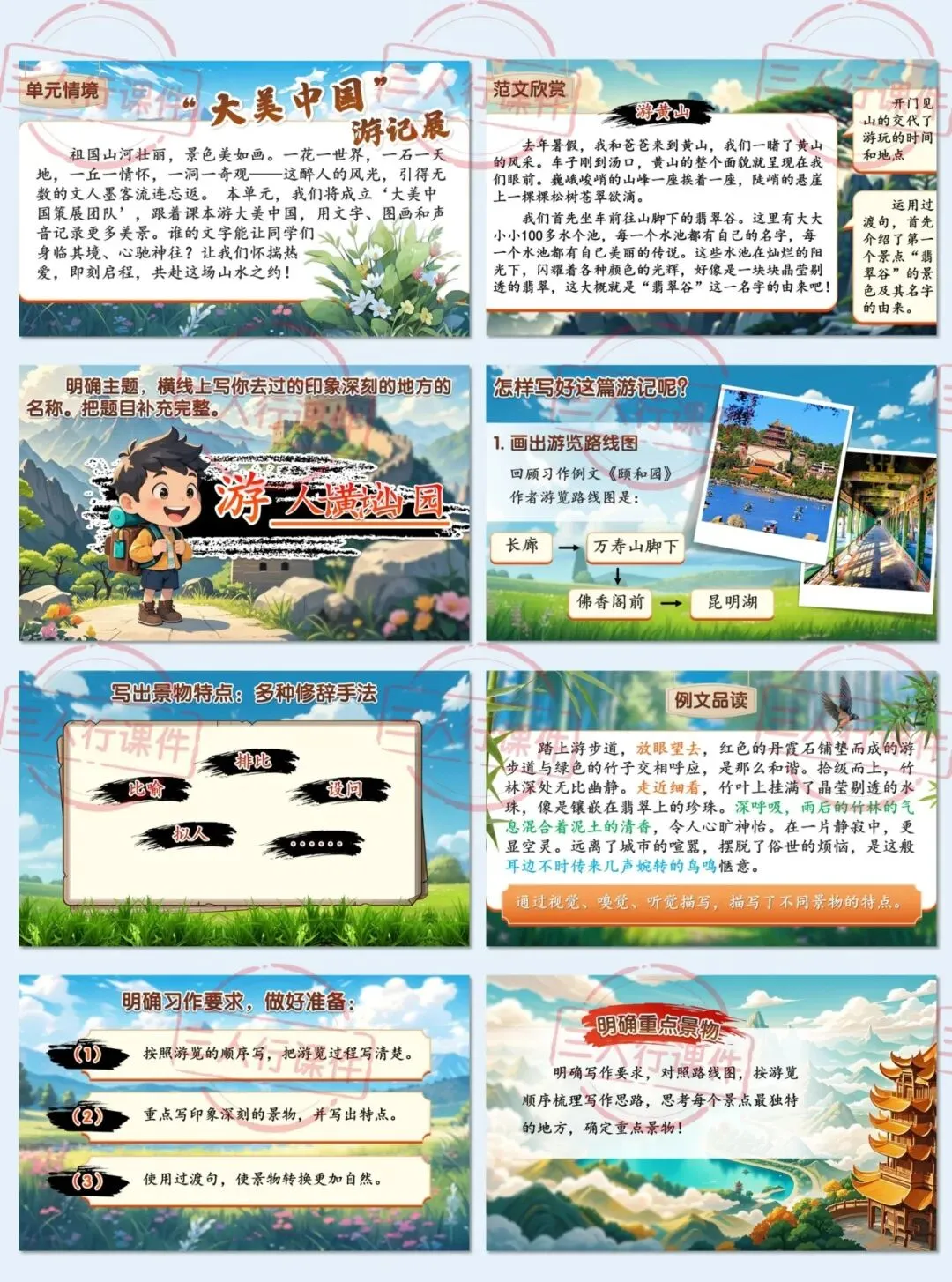 师:选定了地点,那怎样才能把这篇游记写好呢?咱们先来回顾一下学过的课文,找找灵感。