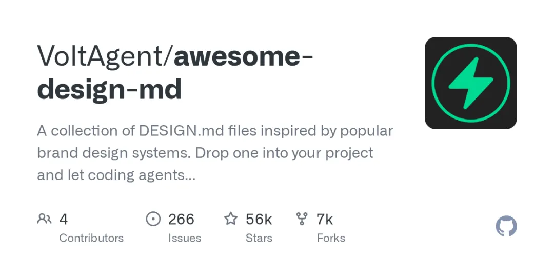 awesome-design-md(56,382 星,fork 率 12.6%)引爆了一个新概念:DESIGN.md——把品牌设计系统转化为纯文本 Markdown 文件,丢进项目根目录,让 AI 编码 Agent 自动生成风格一致的 UI。