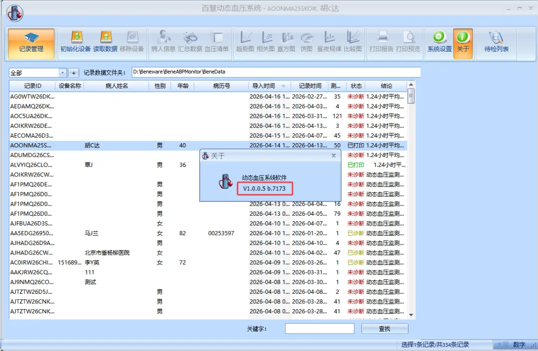 百慧动态血压软件怎么升级?目前比较新的血压软件版本是2026年初发布的V1.0.0.5 b.7173版本,由于软件版本尾号是7173,以下简称7173版本。要查询你的软件版本号,可以在启动软件之后,点击菜单栏上的【关于】按钮,如果版本尾号比这个低,可以联系当地业务人员获取新版软件。升级步骤