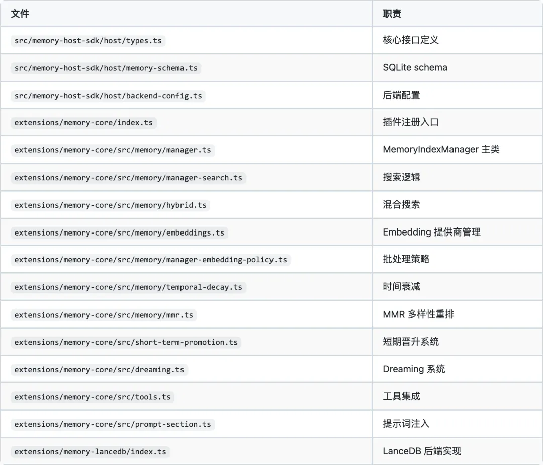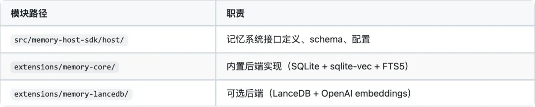 MemorySearchManager 接口 │ ┌────────────┴────────────┐ │ │ memory-core (内置) memory-lancedb (可选) SQLite + sqlite-vec LanceDB + OpenAI + FTS5 全文搜索 独立向量数据库 多 embedding 提供商 自动捕获/回忆2. 存储架构