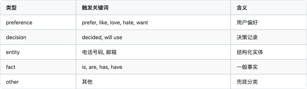 type MemoryEntry = { id: string; text: string; vector: number[]; importance: number; category: MemoryCategory; // "preference" | "fact" | "decision" | "entity" | "other" createdAt: number;};3. 记忆类型系统