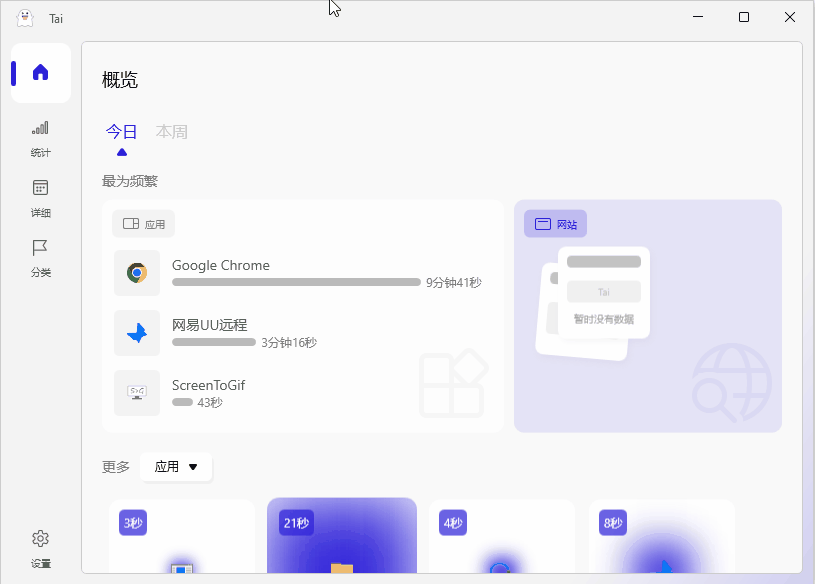 一款在 Windows 上用来统计软件使用时长和网站浏览时长的工具,数据保存在本地,支持按规则筛选和分类统计。