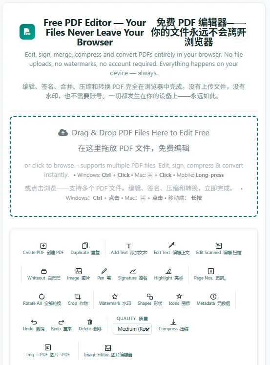 一款拥有20+功能的PDF在线工具,支持编辑、签名、合并、压缩等操作,所有处理都在本地完成,无需上传文件。