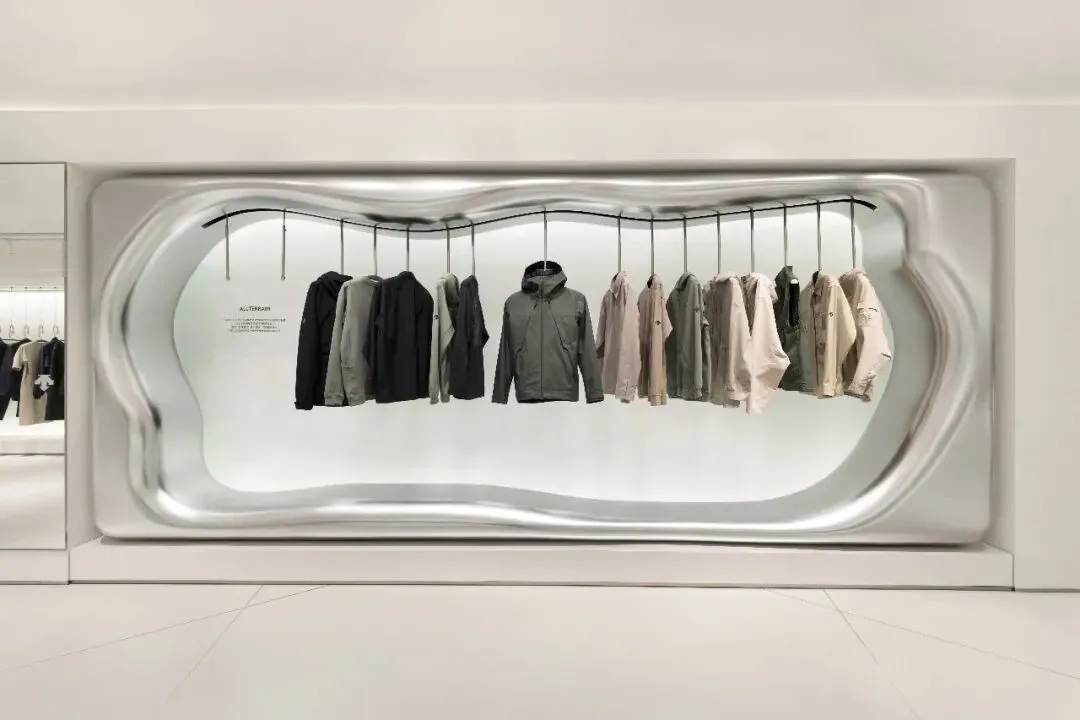 店内空间围绕不同产品系列打造多元陈列场景。「水释冰陆」区域呈ALLTERRAIN系列,该区域以雨水在低温环境中凝结并延展的自然形态为灵感,传递ALLTERRAIN系列产品适应多变环境及地形的特质;「裂冰之地」区域聚焦DUALIS系列,通过挺拔的线性结构呼应城市天际线,契合其作为都市机能系列在都市通勤与日常运动中的多样适配性;高尔夫系列陈列于「琉璃弧线」空间,以流线型结构模拟球体轨迹,展现高球运动的优雅与精准。(来源:精炼Gymsquare)