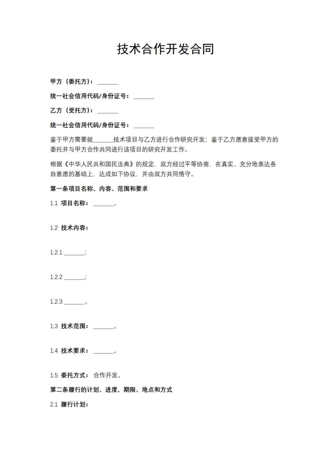 技术合作开发合同模板,WORD文档电子版,可免费下载打印