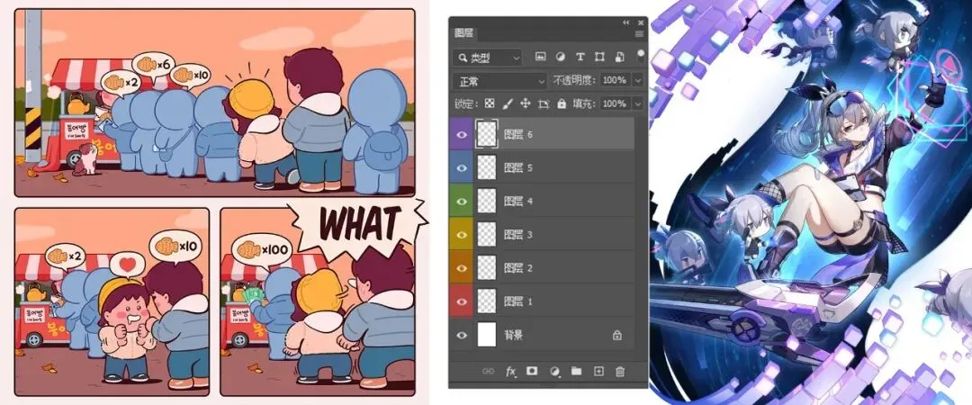 ▲【图层面板】代表着实体绘画中难以实现的各种常用效果;通过不同图层内容互不影响的特征,能够实现便利的针对性改动;同时也可以实现图层之间的效果联动。