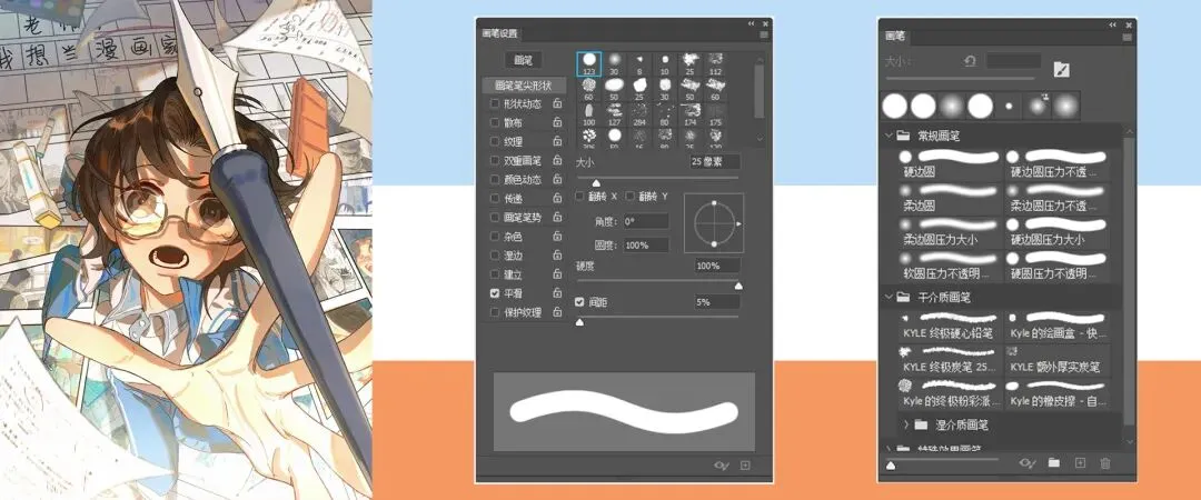 ▲【画笔选项】板绘本身主要还是实现手绘的效果,所以绘画软件往往会搭载丰富的“笔刷”选项;但认识笔刷的效果成因比收集笔刷更加重要,借鉴他人经验只是总结个人经验的参考。