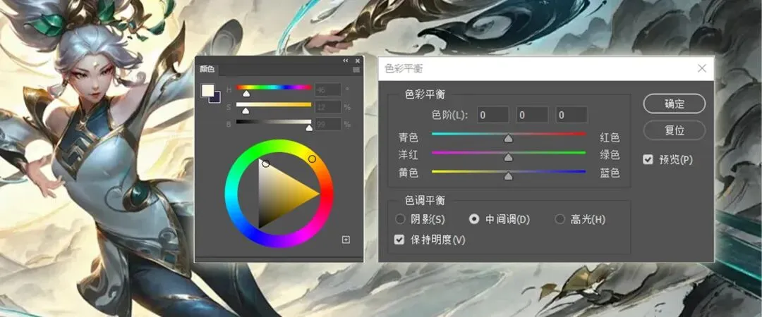 ▲【颜色面板】主要是取色和调色两大功能板块,拾色器面板和颜色面板能够针对性的选取色彩;色彩平衡、色相/饱和度等调色面板则是针对已填充的颜色进行定向改变。