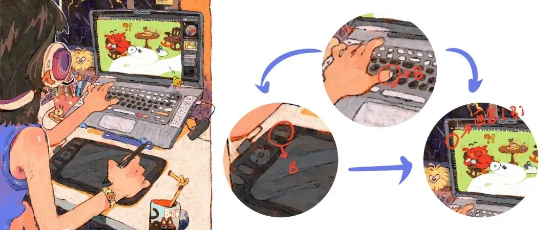 ▲【外设对应】很多刚入手数位板的朋友会对机身搭载的“可自定义键位”的工作原理不理解;如图、通过驱动将【机身键位】→【键盘键位】→【软件功能】进行对应实现功能调用。