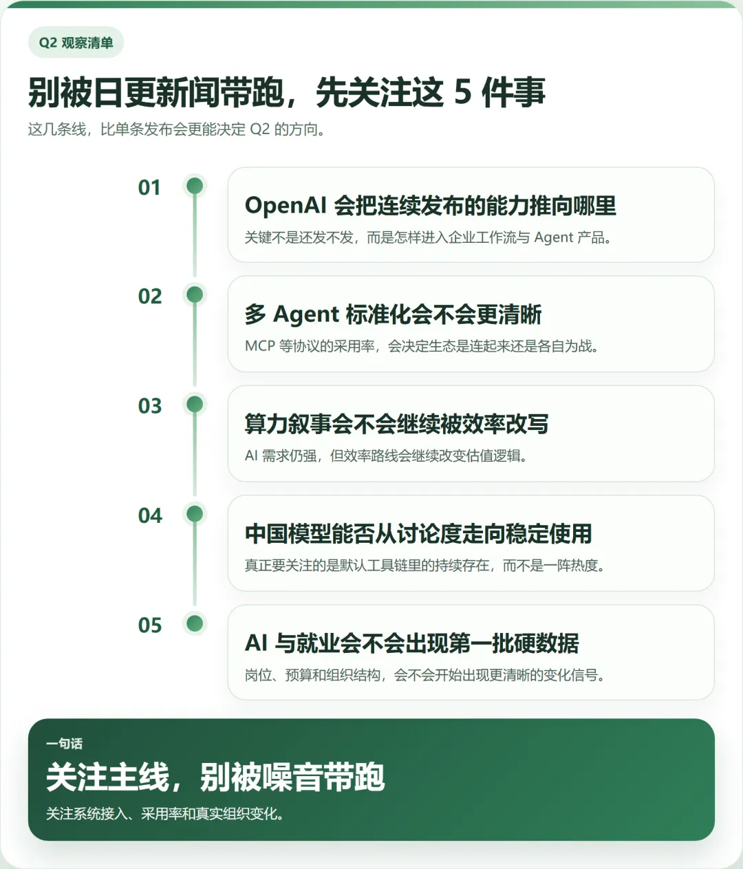 Q2 更值得关注的,不是“还会不会发”,而是这些能力会怎样进入企业工作流、开发者工具链和 Agent 产品。