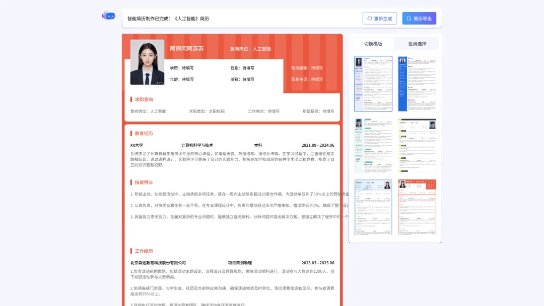 森途学苑AI简历制作工具覆盖从「撰写-优化-分析」全链路,通过AI技术帮助你快速生成和优化简历,全面提升求职竞争力!