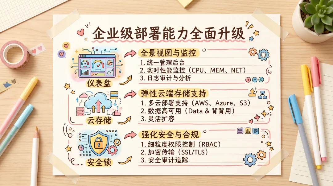 1. 更稳定——令牌健康监控,再也不用担心突然挂掉 2. 更灵活——云存储支持,部署方案更多选择 3. 更省钱——轻量化模式,低配设备也能跑 4. 更安全——12 项安全修复,企业级数据保护