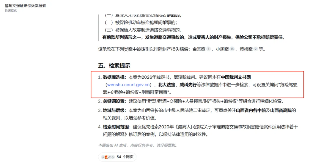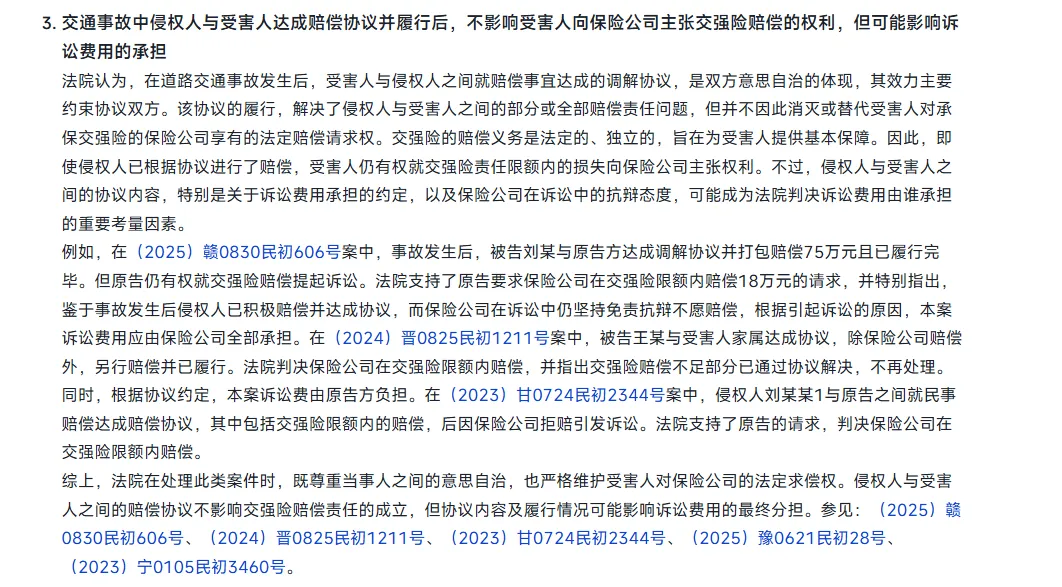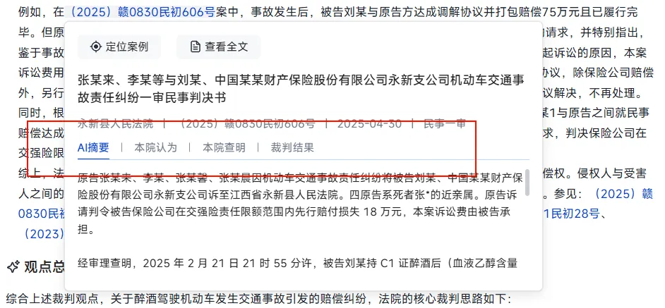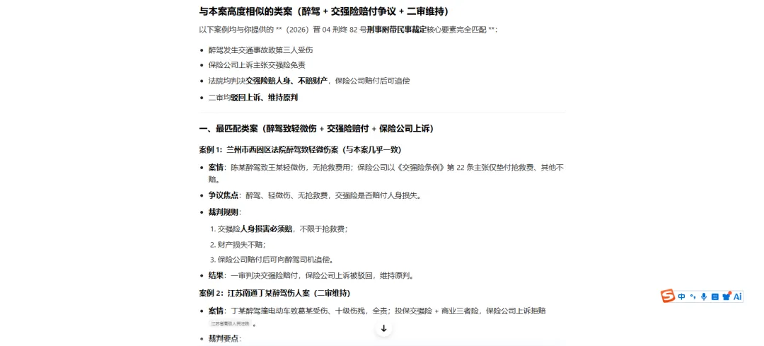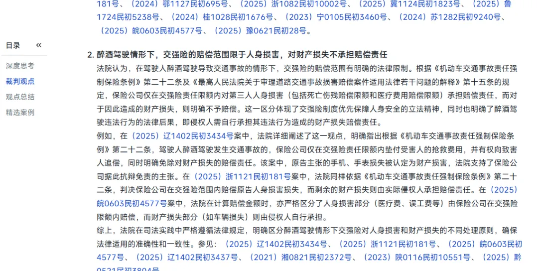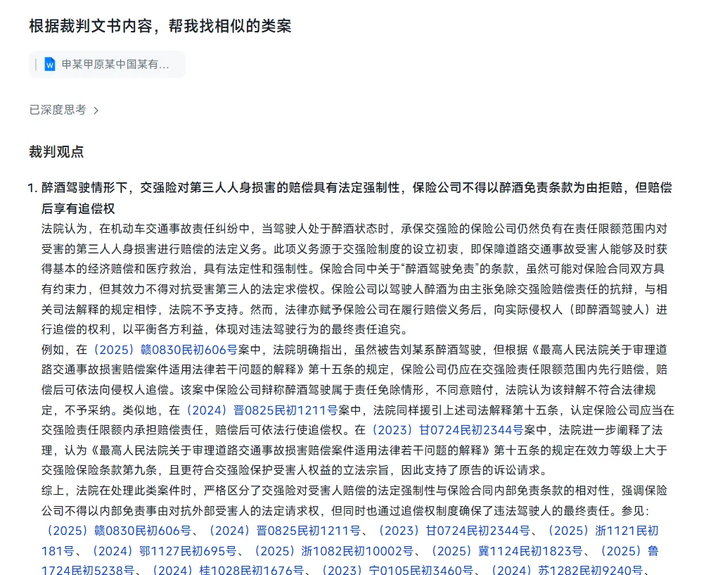 我们在裁判文书网随机下载了一份案由为“危险驾驶”的裁判文书,走了一遍完整流程。操作非常简单:上传文件,输入指令“根据裁判文书内容,帮我找相似的类案”,并选择优先返回近5年案例。不需要反复琢磨任何关键词。可以看到,智合AI基于近5年的案例,从裁判观点的角度出发,基于裁判文书,总结了3大裁判核心裁判,并且根据每一条裁判观点的内容,进行了简要的分析并给到了相关的案例:① 醉酒驾驶情形下,交强险对第三人人身损害的赔偿具有法定强制性,保险公司不得以醉酒免责条款为由拒赔,但赔偿后享有追偿权法院认为,交强险制度的设立初衷是保障交通事故受害人能及时获得基本救济,具有法定性和强制性。保险合同中关于“醉酒驾驶免责”的条款,虽然在投保人与保险公司之间有约束力,但其效力不得对抗受害第三人的法定求偿权。同时,法律赋予保险公司在赔付之后向实际侵权人(即醉酒驾驶人)追偿的权利,以平衡各方利益,体现对违法驾驶行为的最终责任追究。② 醉酒驾驶情形下,交强险的赔偿范围限于人身损害,对财产损失不承担赔偿责任根据《机动车交通事故责任强制保险条例》第二十二条及相关司法解释,交强险仅在死亡伤残赔偿限额和医疗费用赔偿限额内对第三人人身损害承担赔偿责任,对因此造成的财产损失,则明确不予赔偿。手机、手表等财产损失,均由侵权人自行承担。③ 交通事故中侵权人与受害人达成赔偿协议并履行后,不影响受害人向保险公司主张交强险赔偿的权利,但可能影响诉讼费用的承担即使侵权人已自行赔偿并与受害人达成协议,受害人仍有权就交强险责任限额内的损失向保险公司主张。但法院在判决诉讼费由谁承担时,会综合考虑侵权人的赔偿态度、保险公司的抗辩立场,以及引起诉讼的责任归属。每一条观点,系统都不是“凭空生成”的——所有援引的案号均以蓝色标注,点击即可直接弹出案件详情卡片,包含AI摘要、本院认为、裁判结果等核心信息,无需跳转页面,也无需再自己去翻文书。智合AI的系统背后,支撑的是1.68亿+专业裁判文书数据库,并收录了最高人民法院发布的入库案例等高价值数据源。收录案例包括入库案例、最高法指导性案例、最高检指导性案例、公报案例、官方典型案例等!目前,智合AI正为所有法律人提供免费试用,扫码下面二维码添加客服,即可领取免费试用。⬇️