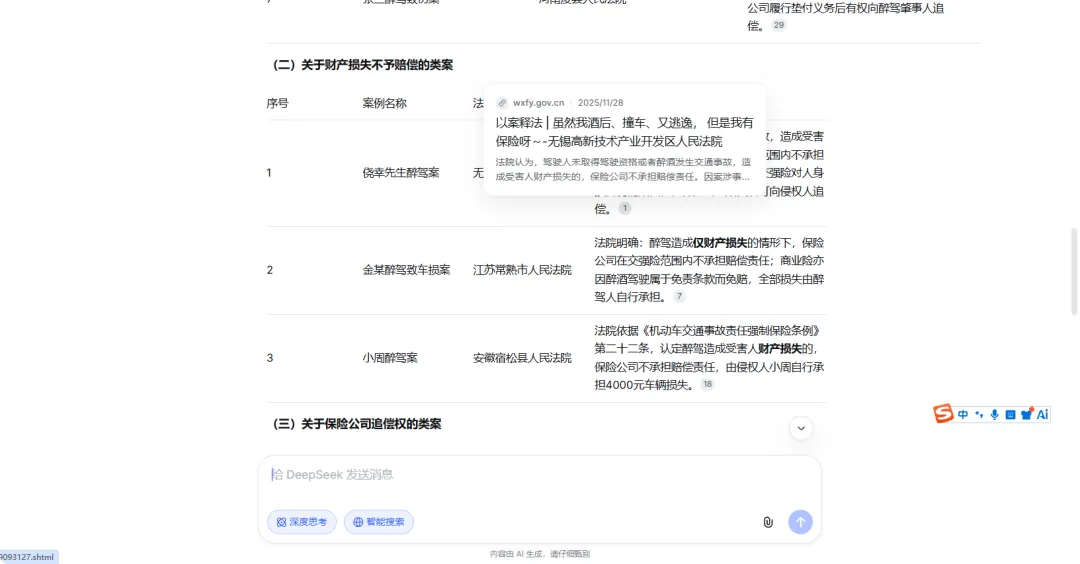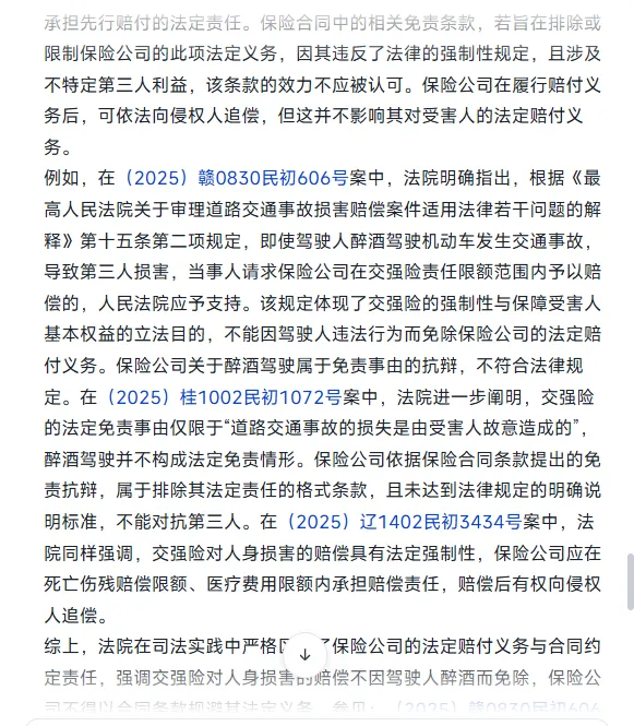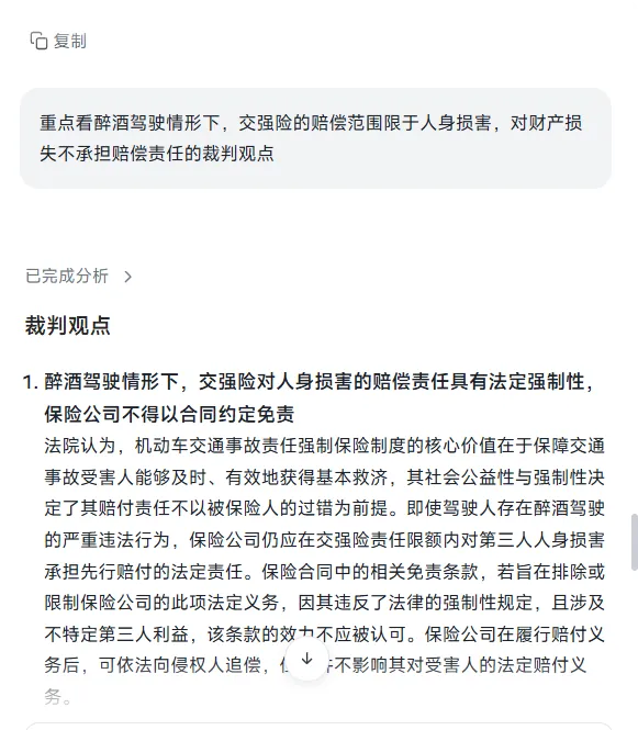 这些,都可以通过【追问】功能直接深挖,不用每次重新从零开始检索。我们以其中一个争议点做了示范——持续追问“醉酒驾驶情形下,交强险的赔偿范围限于人身损害,对财产损失不承担赔偿责任”这一观点,系统进一步展开了分析,并持续给出案例:- 法定赔偿义务不可免除:交强险制度的社会公益属性决定了其赔付责任不以被保险人的过错为前提;