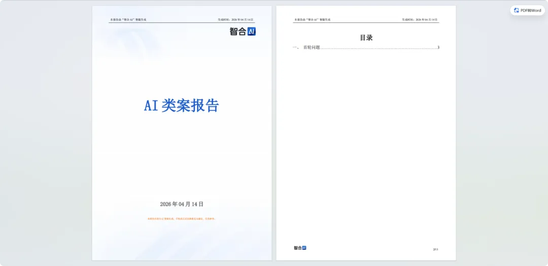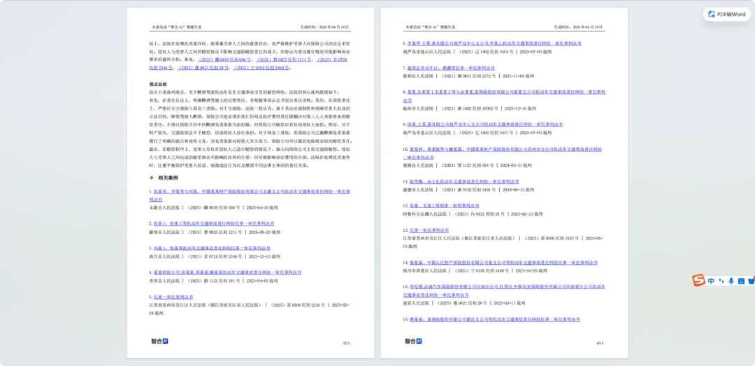 在智合AI完成检索之后,系统会自动生成一份类案检索报告:裁判观点已梳理分层,相关案例已按相关度排列,所有案号均可超链接跳转至原始裁判文书。这份报告,可以直接用于交付。不需要再手动整理、排版、核实来源。对于需要向客户或法院提交类案检索结果的律师来说,这一步省下来的时间,远不止是“效率提升”——它让你能够把精力放回到真正需要专业判断的地方。