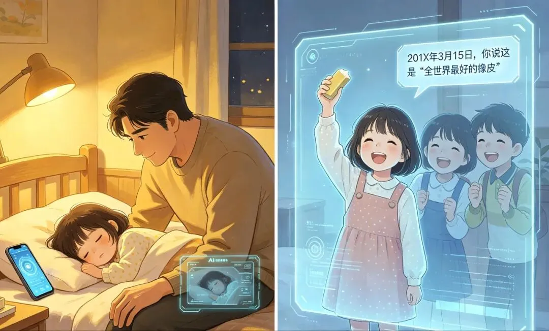 比如女儿现在每天放学都会跟我絮叨“今天小雨把橡皮掰了一半给我”“数学老师夸我竖式写得直”,这些碎碎念转头就可能被柴米油盐盖过去。但AI或许会悄悄记下:她提到“小雨”时语速会变快,说到“老师夸我”时会下意识摸一下书包上的小熊挂件。20年后,当她长成 teenager,某天突然说“想不起来小学最好的朋友长什么样了”,AI会调出那段语音记录,结合她当时的表情微数据,生成一段动态小剧场:扎着羊角辫的她,正举着半块橡皮跟另一个小女孩碰拳,阳光透过教室窗户,在她们脸上投下毛茸茸的光晕。