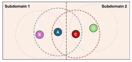在经典的 DD 模拟中,空间被划分为多个子域,每个 MPI 进程负责一个子域。为了计算跨域的相互作用,通常需要建立“影子原子(Ghost Atoms)”层。然而,神经网络势能对邻居信息的要求远比经典力场严苛,传统的通信模式往往会导致严重的性能损失。
