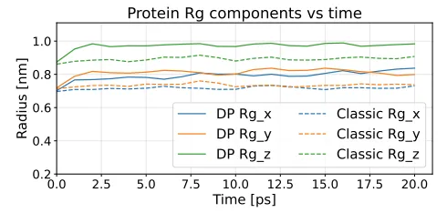 Figure 8:DPA-1 与经典力场模拟下蛋白质回转半径随时间的变化对比