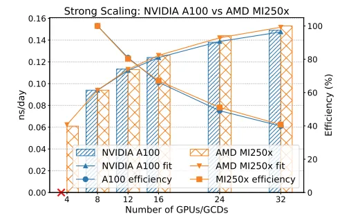Figure 10:NVIDIA A100 与 AMD MI250x 的强缩放性能对比图