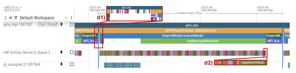 研究团队使用 ROCm System Profiler 进行了深度剖析,揭示了 AI MD 模拟的时间分配: