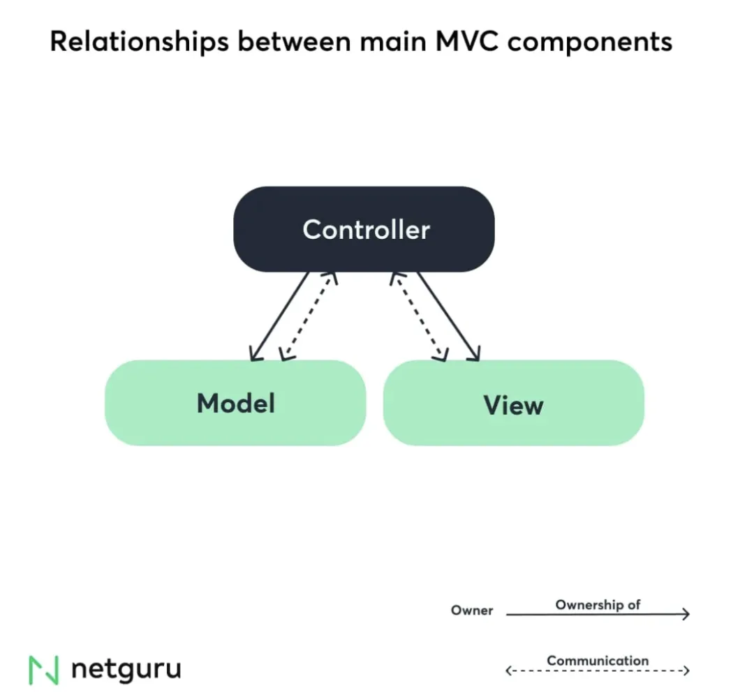 模型(Model):负责存储数据,不为视图需求处理数据,完全不感知视图的存在。模型数据是构建精准展示界面的核心。 视图(View):承担两项职责——向用户展示数据、接收用户操作。完全不感知模型,由其持有者(控制器)传入处理后的数据更新,因此视图不应包含任何业务逻辑。 控制器(Controller):持有并通信视图与模型层,负责用模型的处理数据更新模型和视图。最简场景下,控制器通常作为视图的代理,或为视图设置回调,基于用户操作更新模型与视图。