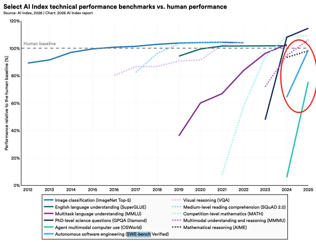 Stanford HAI(斯坦福大学人本AI研究院)昨天发布了《2026 AI Index report》。看到一些中文解读都是关于"中美差距缩小到2.7%"、"SWE-bench从60%飙到接近100%"这些数据点上。