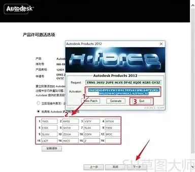 20.输入激活码:①使用快捷键“Ctrl+C”复制【Activation】后框中的激活码;②使用快捷键“Ctrl+V”将激活码粘贴到【激活码输入框】中;③点击【Quit】;④点击【下一步】。