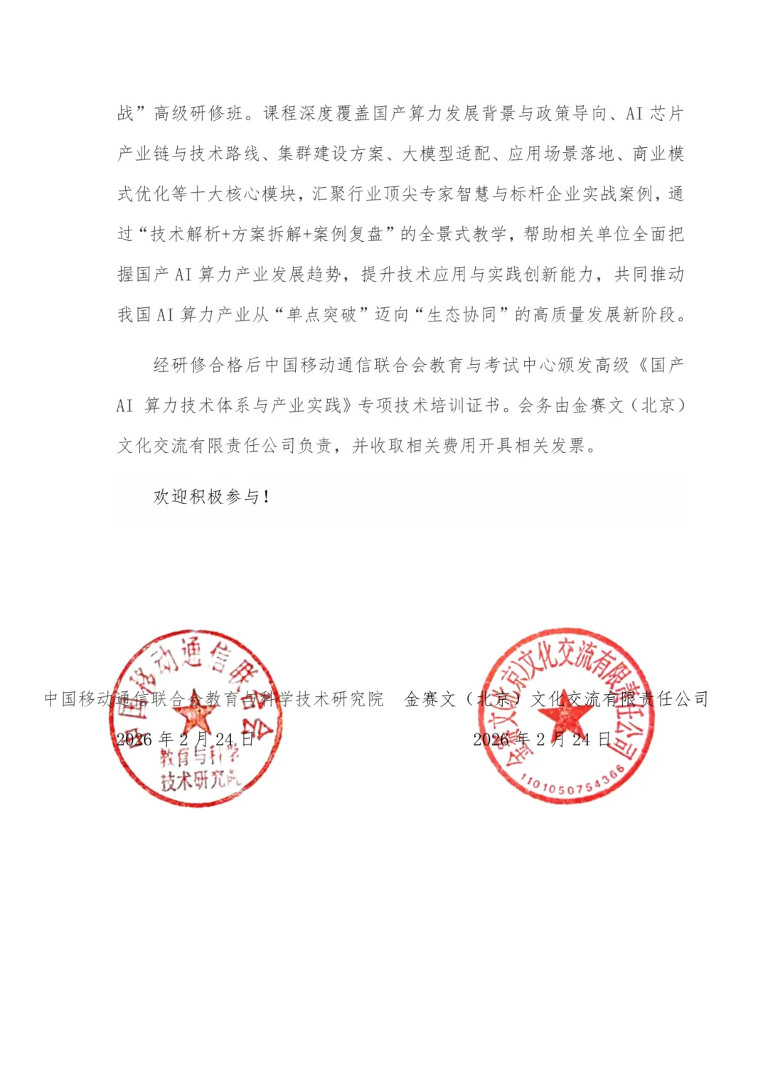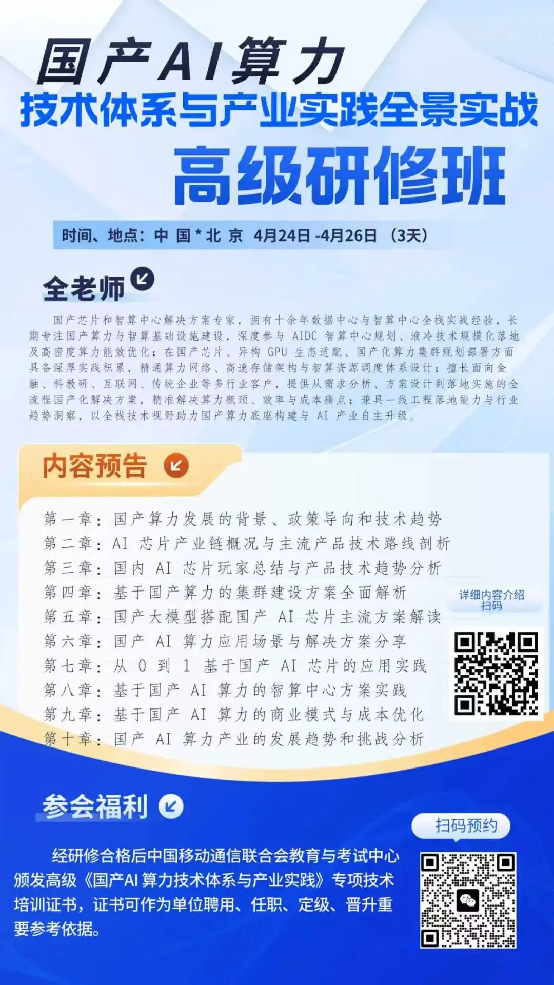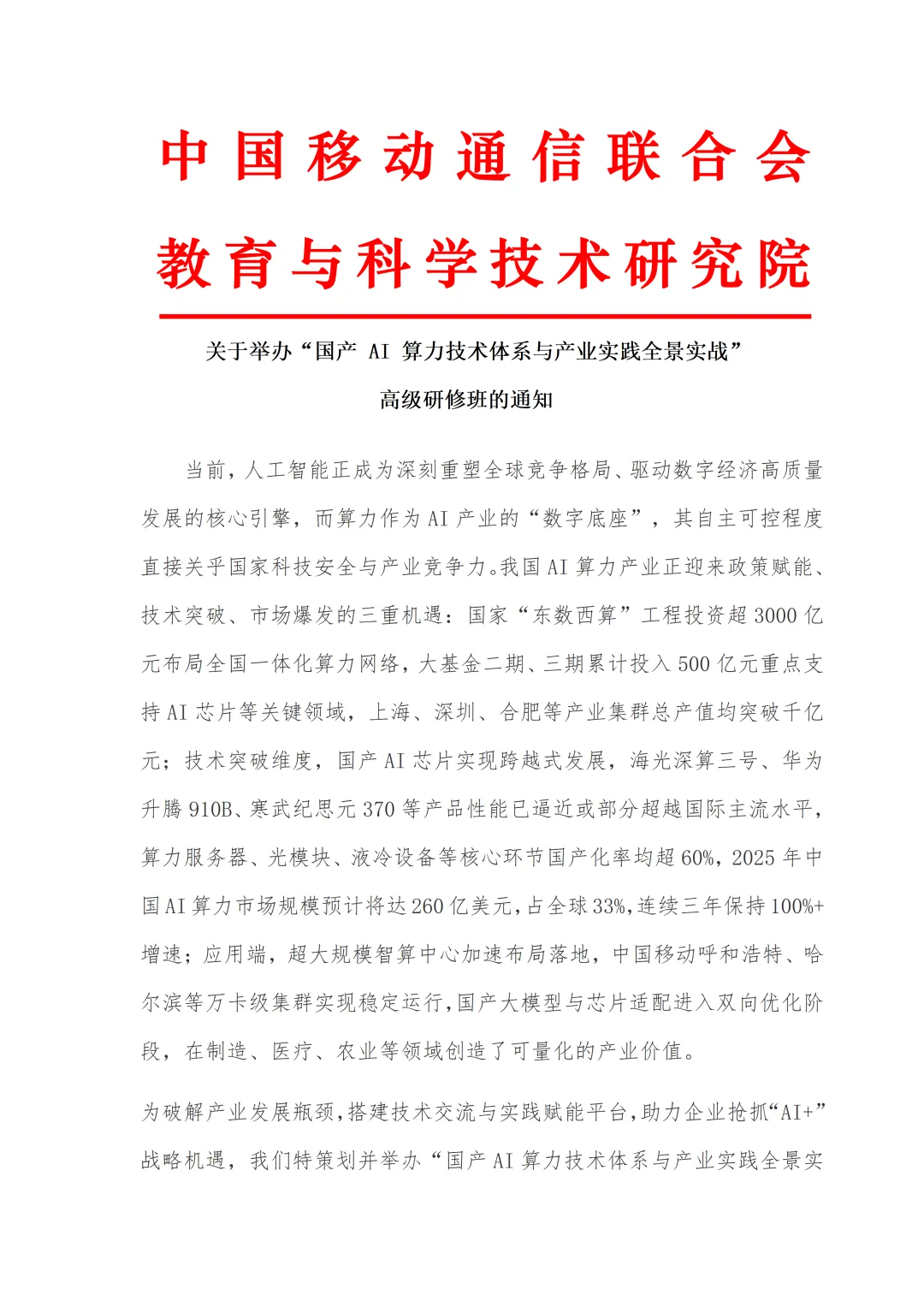 经研修合格后由中国移动通信联合会教育与考试中心颁发高级《国产AI算力技术体系与产业实践》专项技术培训证书,证书可作为单位聘用、任职、定级、晋升重要参考依据。