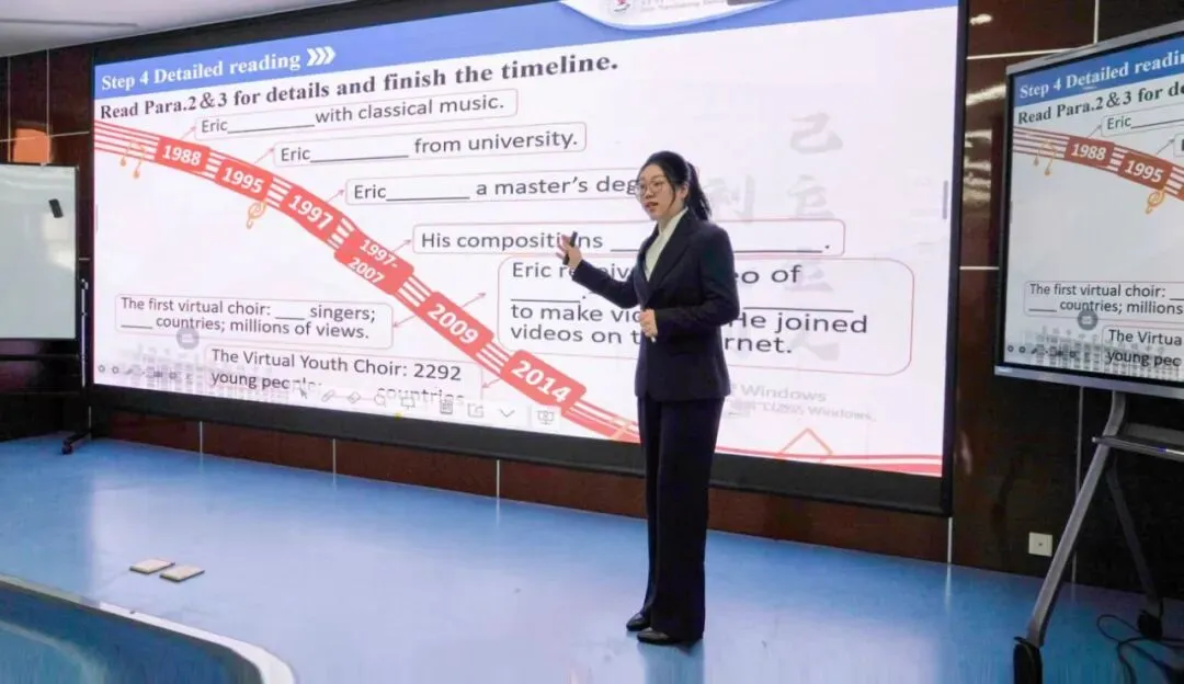 本节课教师以“虚拟合唱团”为主题情境,使学生们既学习了阅读知识又发展了欣赏音乐的德育目标。并且教师运用“AI赋能技术”,邀请主人公Eric进入并贯穿阅读课堂始终,从而提高学生学习兴趣、拓宽学生学习视野。