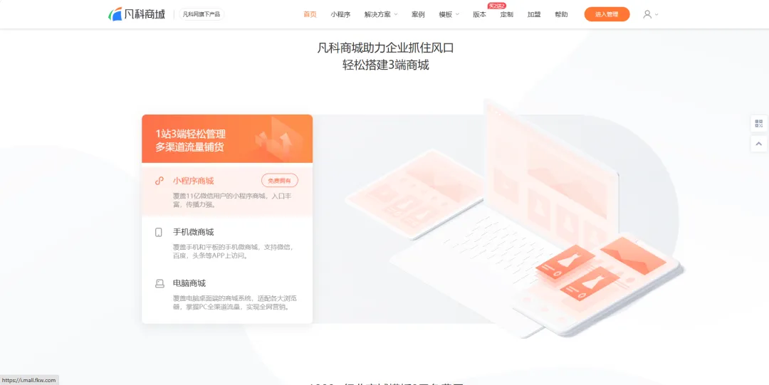 凡科2010年就成立了,那时候微信还没诞生呢。一开始做PC网站搭建,后来跟着移动互联网一路转型,现在主打仗是微信小程序商城。