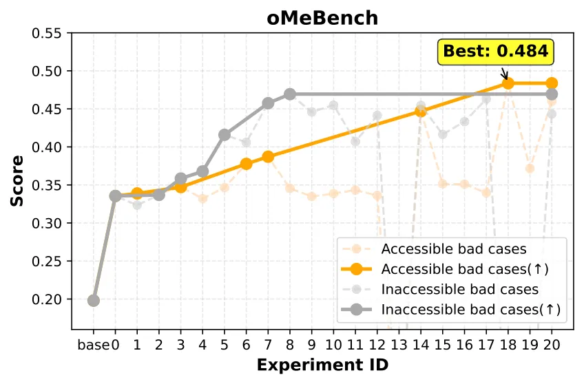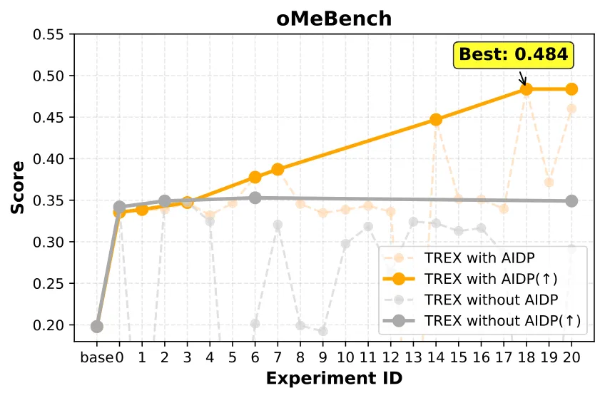 TREX 的实验诊断与归因 模块会检查验证集中的失败案例,对比当前和历史实验的指标变化。消融实验证明:引入坏例分析后, Agent 能更精准地定位问题来源(是数据质量?还是训练不充分?),从而在后续迭代中做出更有针对性的调整。