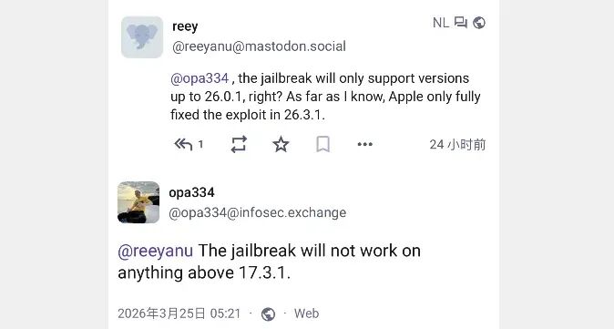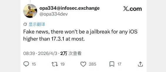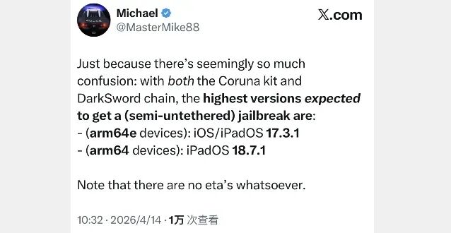 越狱大佬确认!iOS 17/18 arm64 越狱即将发布。