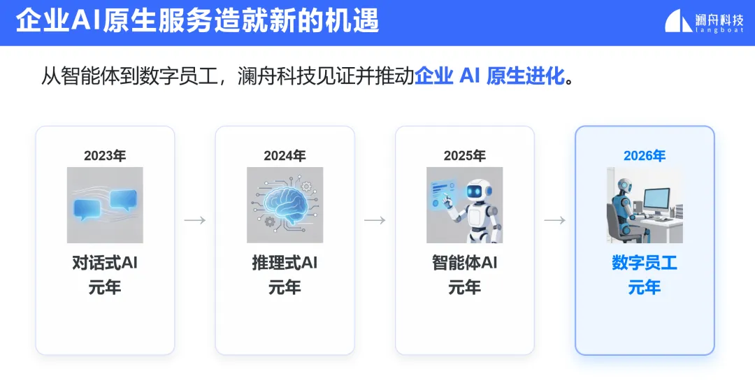 依托政策红利、技术成熟与市场需求,澜舟科技将携手生态伙伴,以AI 原生为基、智能体工程为纲、可信 AI 为盾,开启企业服务软件智能化新时代,推动中国企业数字化转型迈向更高阶的数字员工协同时代。
