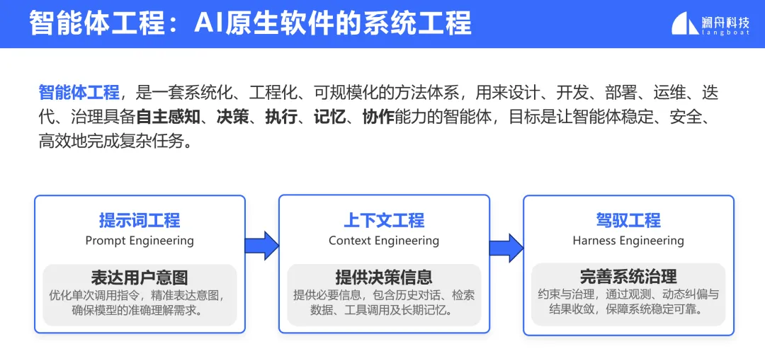 澜舟智能体工程以提示词工程、上下文工程、驾驭工程为三大支柱,解决智能体意图理解、信息补充、行为管控、长程任务与多智能体协同等核心问题。其中「驾驭工程」作为智能体的「控制中枢」,通过感知控制、能力边界、行为规则、错误恢复四大机制,让 AI 从「聪明」变得「靠谱」,实现可控、可信、可靠的企业级落地。