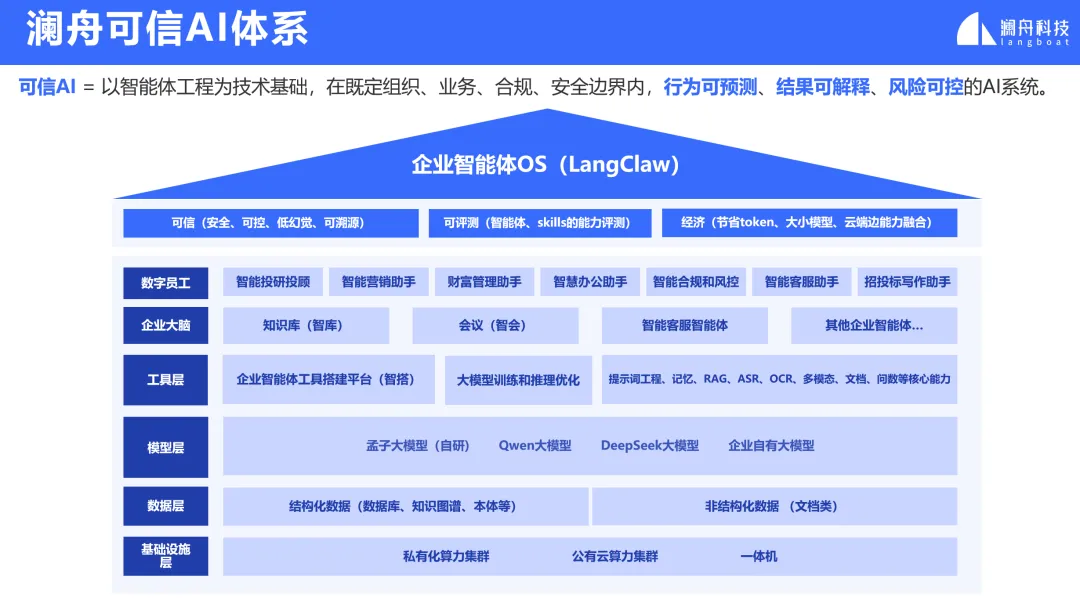 依托 AI 原生与智能体工程,澜舟科技构建全栈可信 AI 技术体系,定义「在组织、业务、合规、安全边界内,行为可预测、结果可解释、风险可控」的企业级 AI 标准,覆盖四大核心能力: