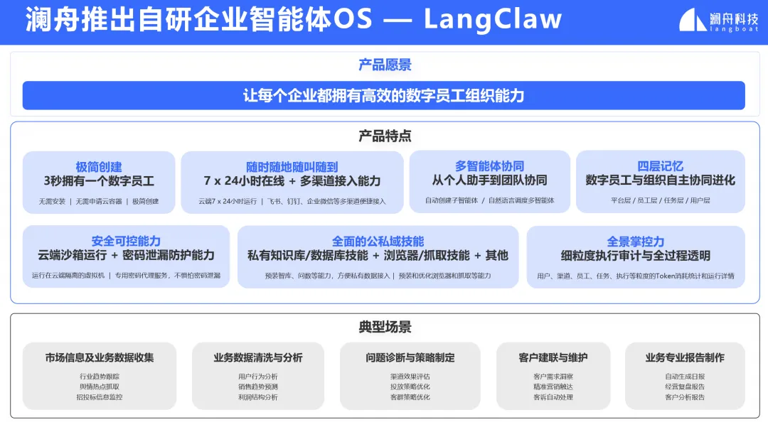 企业智能体 OS(LangClaw):作为数字员工统一运行底座,支持自然语言转任务、跨系统操作、多数字员工协同、安全沙箱执行、全链路审计等核心能力,实现效率、成本、组织、系统四大价值重构;