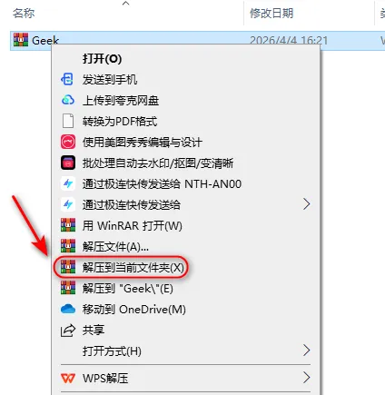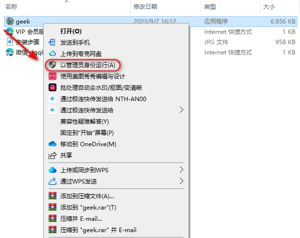 2.打开解压后的文件夹,鼠标右击【geek】选择【管理员身份运行】