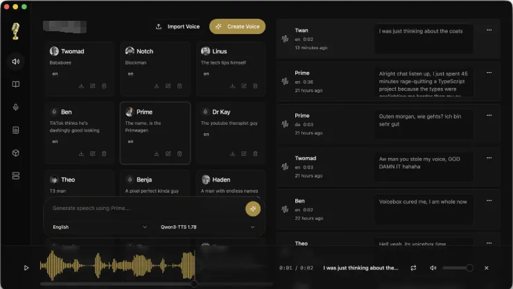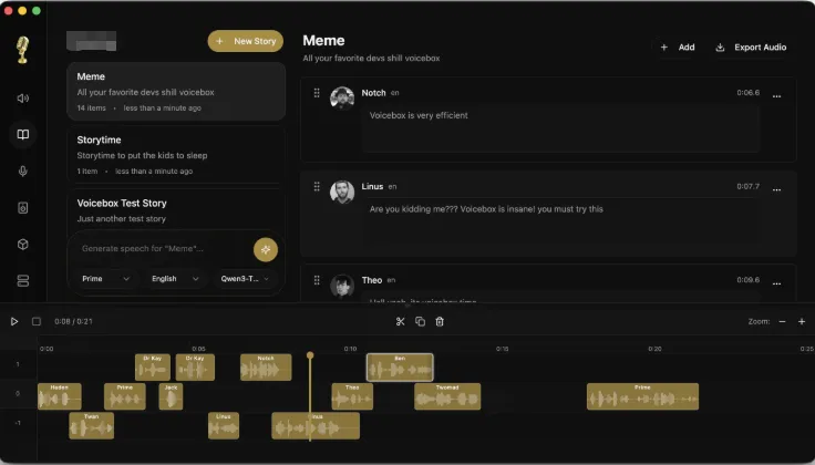 这是一家本地优先的语音克隆工作室 替代方案。从几秒钟的音频中克隆语音,在5个TTS引擎中生成23种语言的语音,应用后期处理效果,并使用时间线编辑器创作多语音项目。