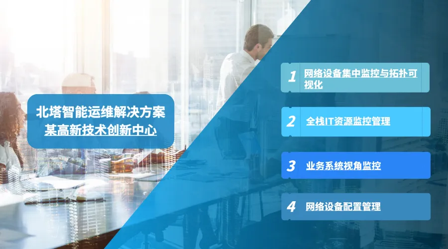 本期案例优选,向您介绍某市高新技术创新中心智能运维项目。北塔软件智能运维平台,如何赋能其打造智能运维新体系,助力创新中心平台业务系统保持7×24小时的健康、持续、稳定、高效运行。