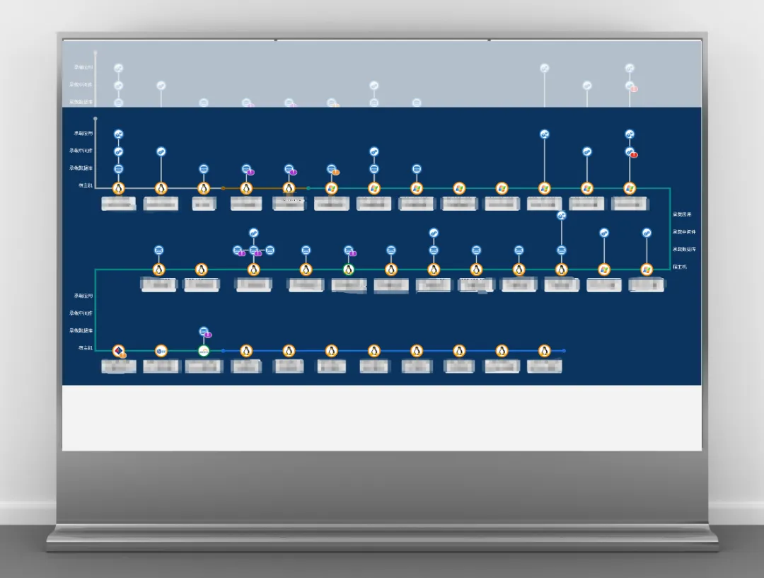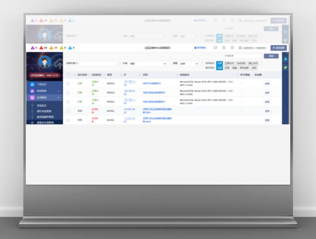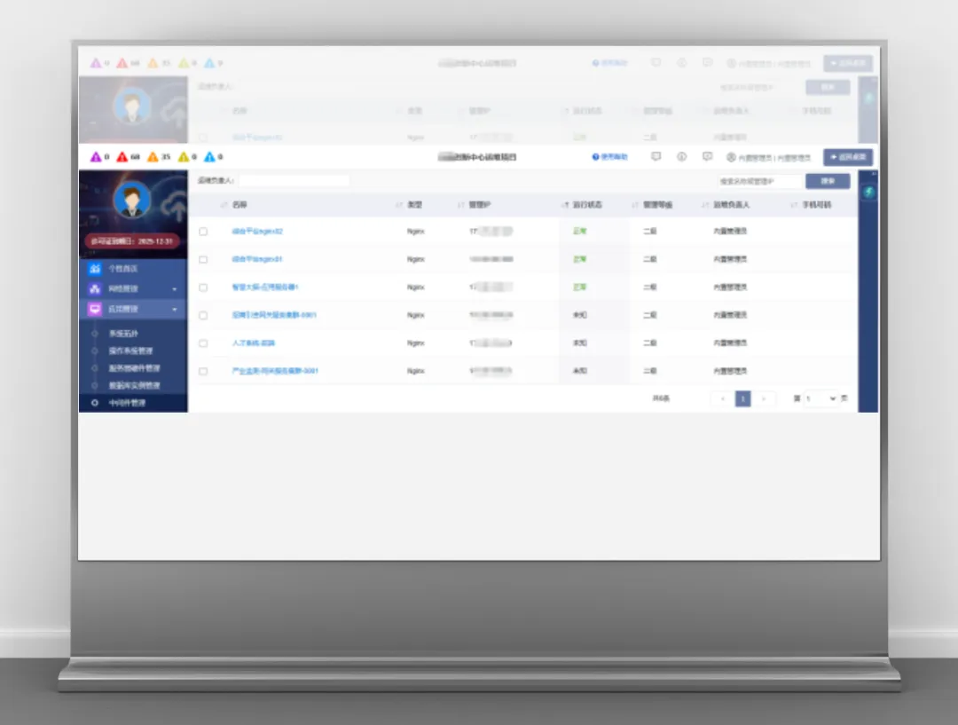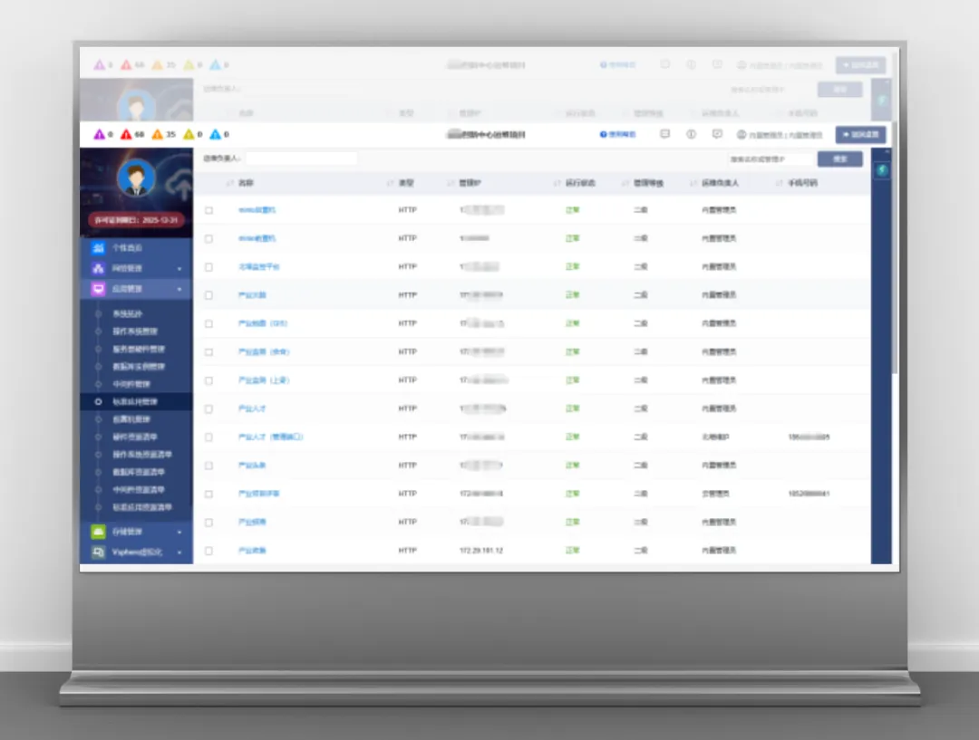 以创新中心各产业平台业务系统为核心,对主机、数据库、中间件及应用之间的承载关系进行整合展示,实现业务系统运行状态的可视化呈现。