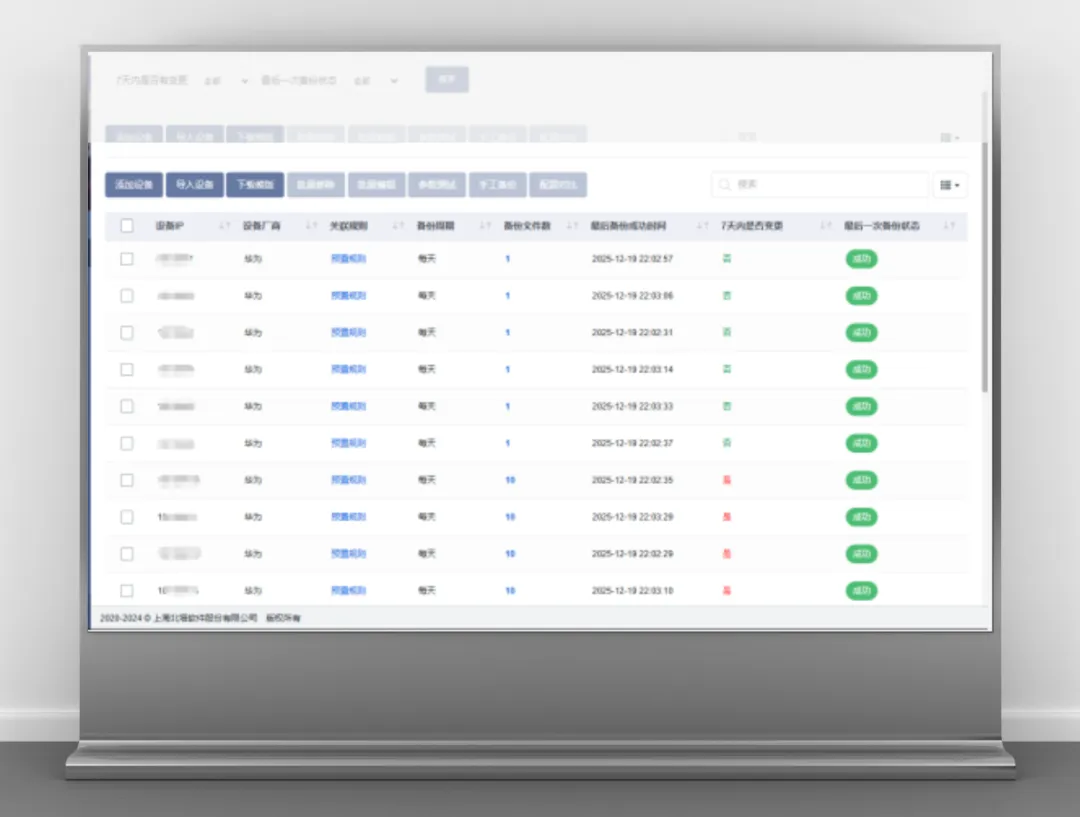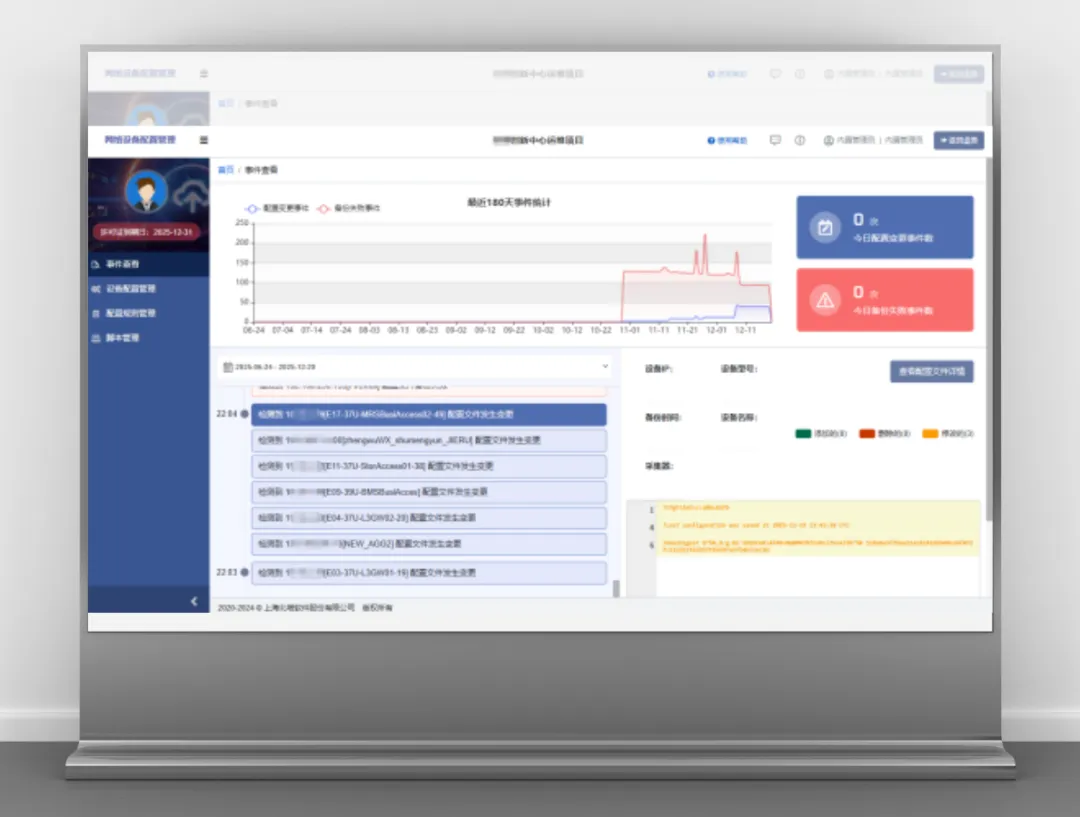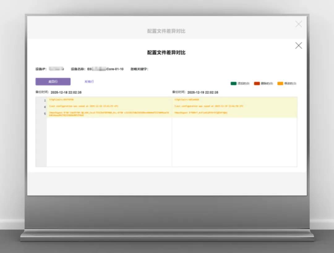 需对网络设备配置进行统一备份与管理,实现配置自动备份、变更检测及快速恢复能力,降低配置变更带来的风险。