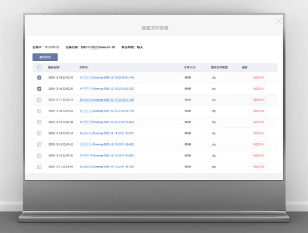 支持配置文件定期自动备份、配置变更检测及差异对比展示,当配置异常或设备故障时,可快速进行配置恢复,提升运维效率并降低操作风险。