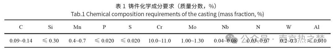 目标铸件为某型汽轮机高压内缸的上半,如图1 所示,其材质为ZG12Cr10Mo1NiWVNbN,质量9.2t,具体化学成分见表1,力学性能见表2,高温持久性能见表3。最大轮廓尺寸3070mm×1540mm×855mm,最大壁厚470mm,最小壁厚167mm,具有狭窄的内腔结构和法兰凸台。