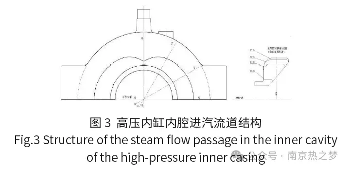 (2)如图3所示,汽缸的进汽流道为蜗壳形状的半封闭结构,高压蒸汽需经进汽流道调整压力和流向后经过动叶片推动转子旋转。进汽流道最小截面尺寸仅为25mm×45mm,该区域最大壁厚为495mm,热节大导致粘砂风险很大。流道表面清洁度要求很高,但进汽腔室型线复杂,易出现夹渣缺陷,故此为最大难点。