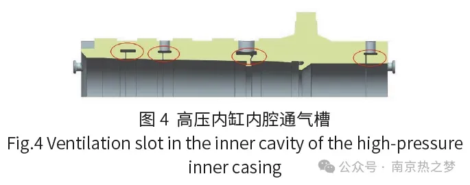 (3)如图4所示,汽缸的内腔存在4处通气槽。通气槽与内腔连通处的宽度仅10mm,4处通气槽圆周方向宽度最大仅为35mm,对应汽缸外壁厚度达到120mm,该区域极易发生粘砂且无法清理。同时,各通气槽处的砂芯厚度很薄且圆周跨度大,砂芯容易发生变形、漂芯和错位等问题。