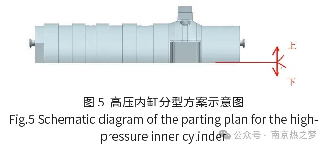 根据汽缸结构特点及初步工艺方案,选择两箱造型方案,如图5所示。明冒口和铸件本体全部位于上箱,模型芯头和浇注系统位于下箱;分型、分模面设计时考虑模具的整体性,尽量减少分模。