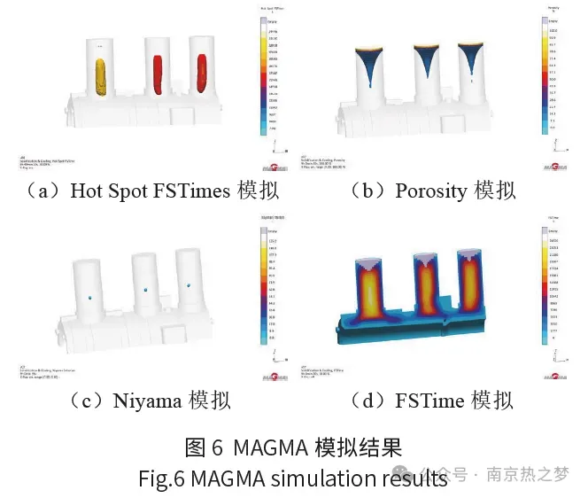 再次利用MAGMA软件对凝固过程进行模拟分析,根据Hot Spot FSTimes、Porosity、Niyama、和FSTime判断,对工艺方案进行优化,最终的工艺方案模拟结果显示:冒口补缩能力充足,补贴补缩梯度设置合理,铸件本体无缩孔、疏松倾向,如图6 所示。