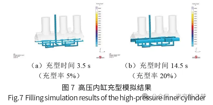 利用MAGMA软件对钢液充型过程进行模拟,充型过程中钢液平稳快速上升,无紊流、飞溅和卷气现象,如图7 所示,浇注系统设计合理。