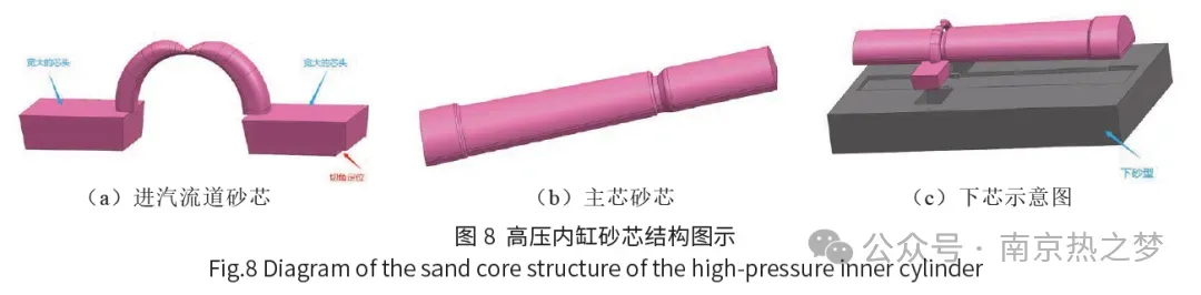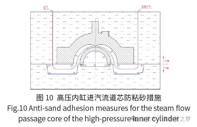 (2)铸件进汽流道砂芯全部使用碱酚醛铬铁矿砂制备,以降低流道粘砂和夹渣缺陷的风险,利用较大的芯头固定在下箱,通过增加受力面积,来减少漂芯、错位等现象。